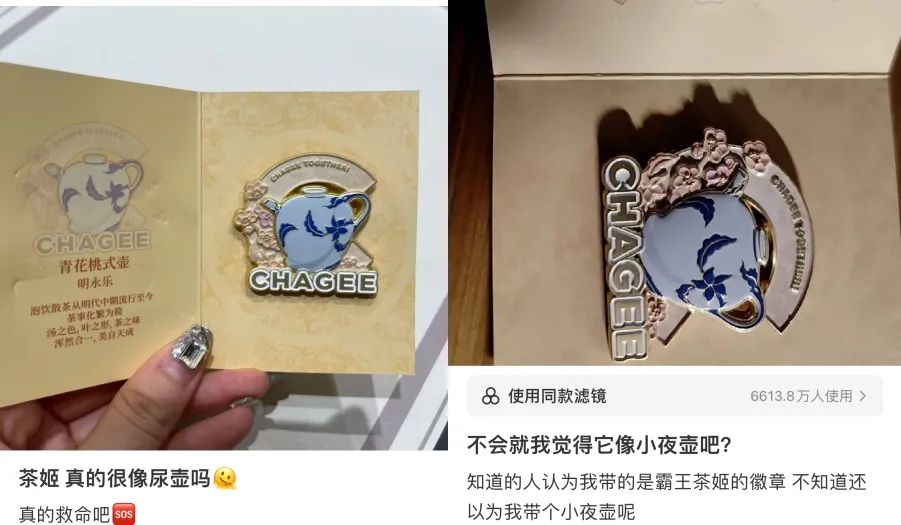 顺便一提,霸王茶姬此前推出的一系列徽章中,有一个青花桃式壶款式的也被吐槽像夜壶。