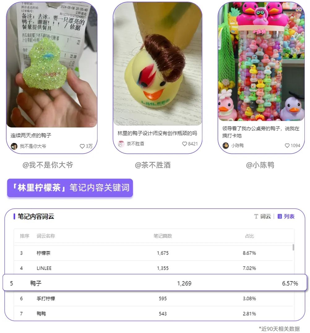 千瓜数据显示,“林里柠檬茶”相关内容关键词中,“鸭子”占据TOP5,凭借丑萌的小黄鸭与其他茶饮品牌展开“错位竞争”,借助当代消费者乐于尝鲜、猎奇的特性,获得广泛关注与互动。