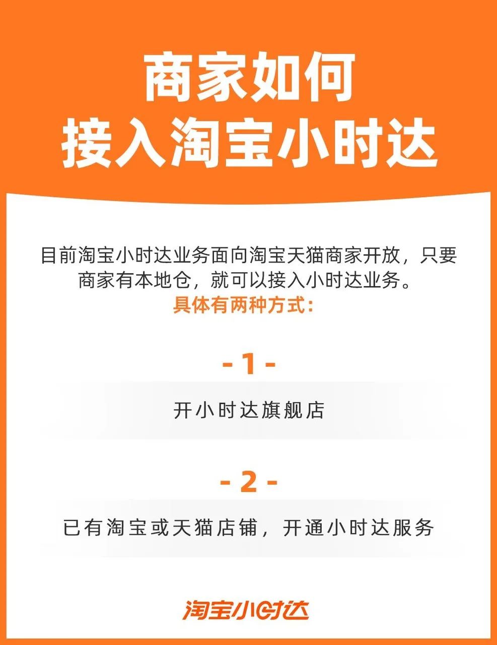此外,淘宝还向所有拥有本地仓库的淘宝和天猫商家开放了小时达业务,商家报名淘宝小时达的方式有两种,一是直接开设小时达旗舰店,二是在已有的淘宝天猫店的基础上开通小时达服务。