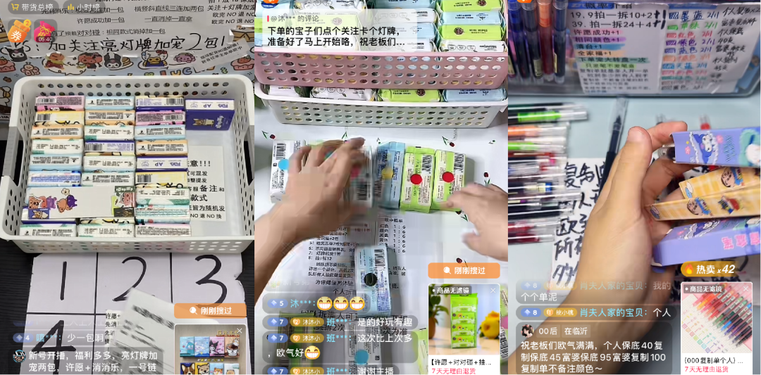 比猎奇穿戴甲稍微实用一些的,可能是这类生活用品盲盒,以小包手帕纸、湿巾、文具为主,同样靠类似的趣味玩法吸引粉丝。