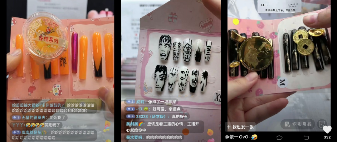 此类直播间拆的穿戴甲除了精致美丽的款式,审美猎奇的款式也很多,靠着炸裂的视觉效果和主播的趣味话术吸引了大量粉丝观看。