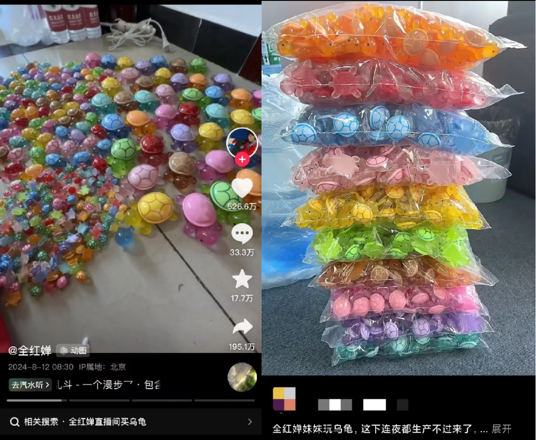 点进去一看,原来是跳水运动员全红婵妹妹,一回国就在某音分享了一堆玩具乌龟。后续有厂家发文称因此爆单,连夜都生产不过来了。
