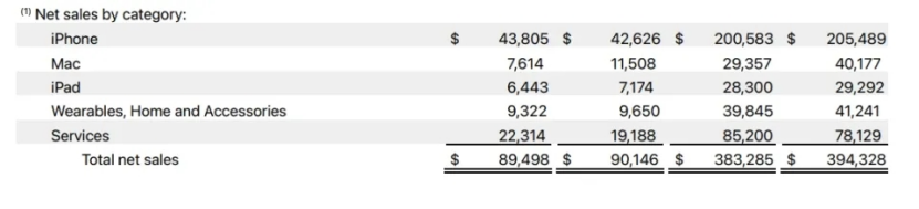 苹果公司2023年Q3分业务净销售额|数据来源:苹果官网