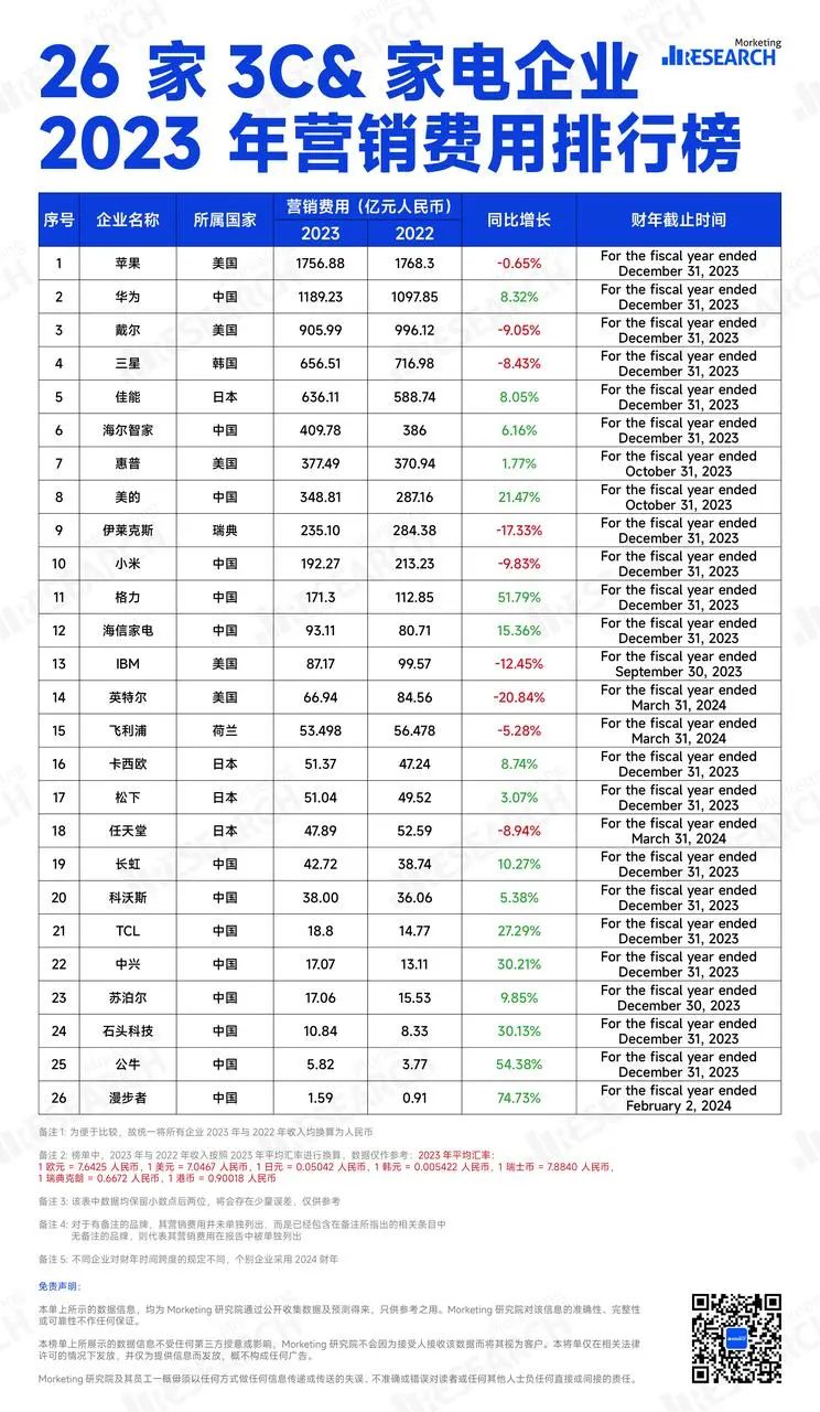 26家3C&家电企业2023年营销费用榜单|数据来源:Morketing Research
