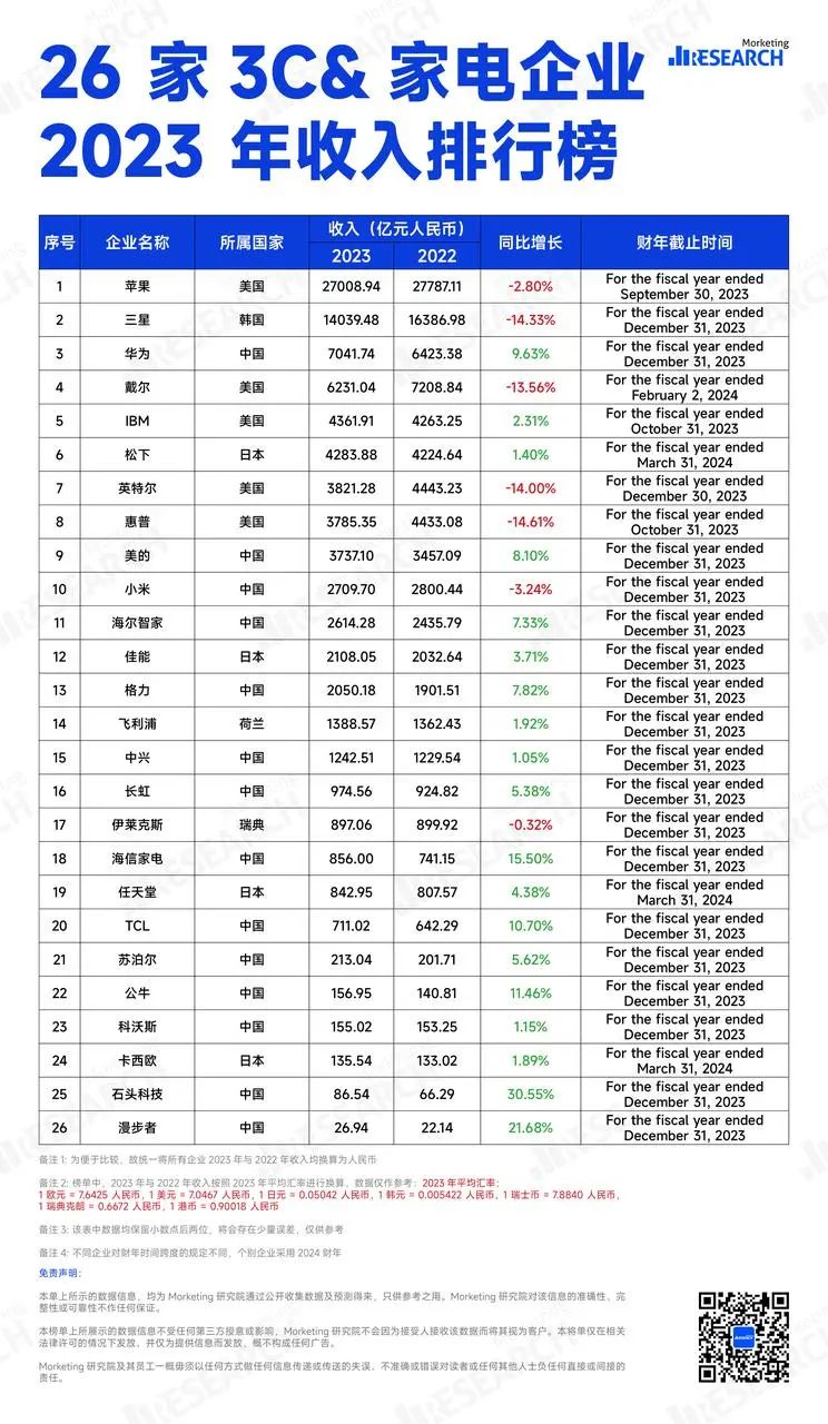 26家3C&家电企业2023年收入榜单|数据来源:Morketing Research