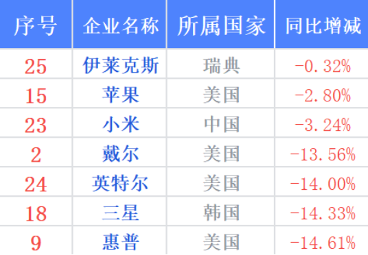 ·在榜单统计的26家企业中,近三成企业的年收入出现下滑的现象,大部分集中在国外各大企业,其中英特尔、三星和惠普营收下滑较为明显;