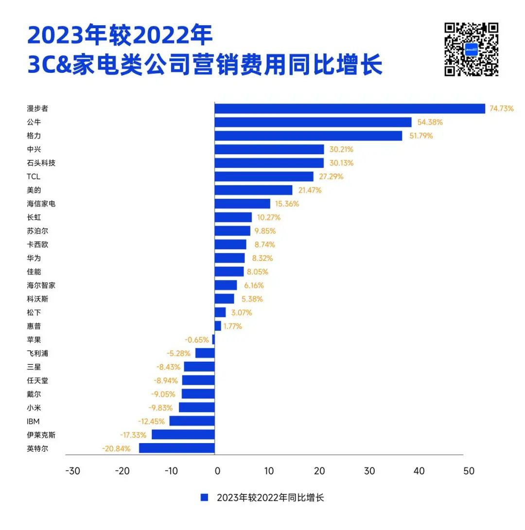 2023年较2022年3C&家电类公司营销费用同比增长榜单|数据来源:Morketing Research