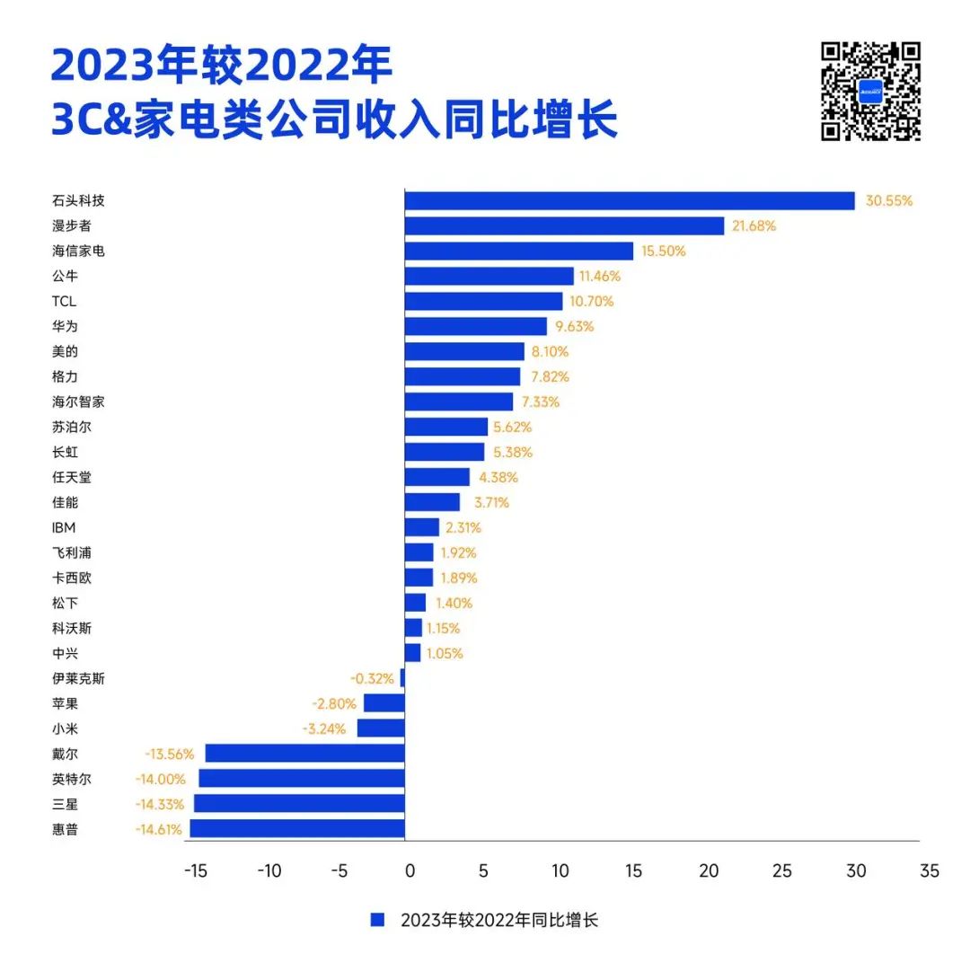 2023年较2022年3C&家电类公司收入同比增长榜单|数据来源:Morketing Research