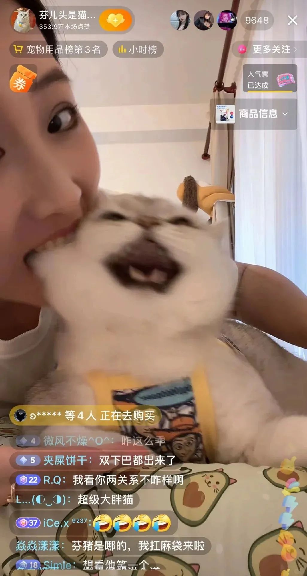 某音上一位名叫@芬儿头是猫不是猪的博主,用自己家猫做萌宠类产品的带货直播。