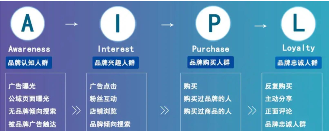以阿里的A(认知)-I(兴趣)-P(购买)-L(忠诚)模型举例,与传统营销漏斗认知-考虑-转化-忠诚本质是一样的,只是换成了更适配用户在阿里系下的语言和定义方式。