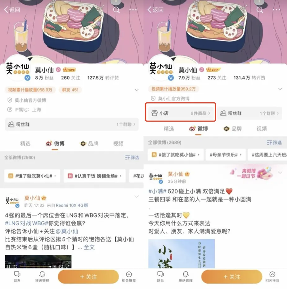 覆盖能力的提升主要得益于莫小仙在微博开通了小店,不仅增加了品牌的曝光度,也是莫小仙试图拓宽销售渠道的进一步举措,“唤醒”沉睡渠道,将品牌影响力推广至微博用户。