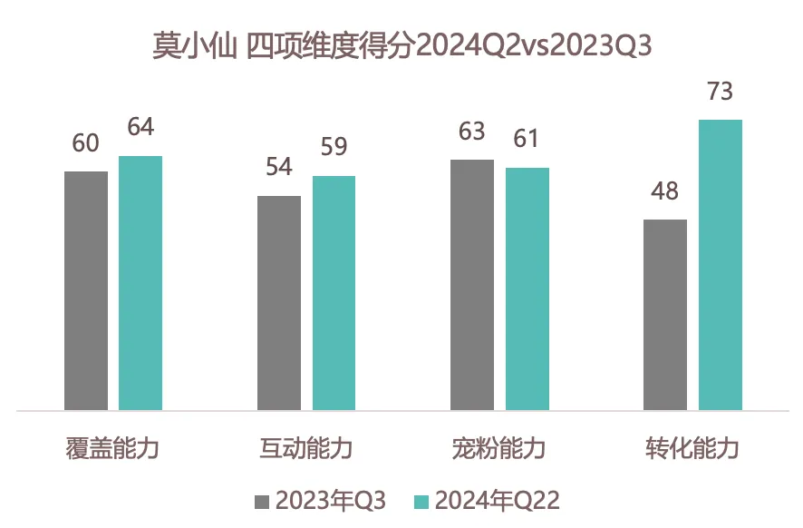 然而,在宠粉能力方面,莫小仙的表现却稍显逊色。本期排名下降15位,得分为61分。可以看出,2024年上半年,莫小仙在粉丝运营和会员积累方面需要进一步优化策略。