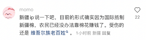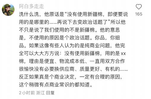 网友4:洗什么洗,他原话是“没有使用新疆棉,即便要说用的是哪里的...再说下去变政治话题了”所以他不只是说了我们使用的不是新疆棉。他的意思是,不使用的原因是个政治话题。你品,你细品。如果这像有些人认为的是纯商业问题,他完全可以大大方方说:没有使用新疆棉,用的是xx棉,理由是便宜、物流成本低、一直用双方合作很愉快没有必要换供应商、质量更好、有机的..反正如果真是个商业决定,一定有合理的原因这个稍微有点商业常识的都知道。