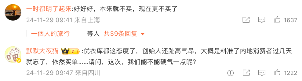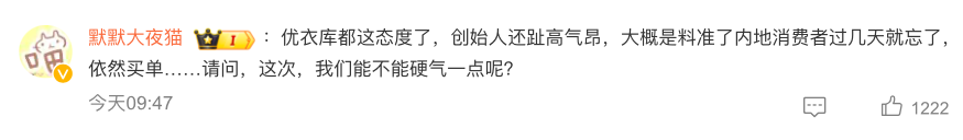 网友3:优衣库都这态度了,创始人还趾高气昂,大概是料准了内地消费者过几天就忘了,依然买单.…请问,这次,我们能不能硬气一点呢?