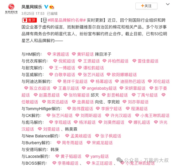 国内众多明星也纷纷公开解约!当时,媒体还专门做过一个统计:
