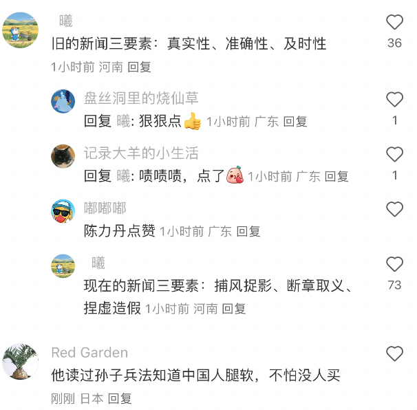 网友9:旧的新闻三要素:真实性、准确性、及时性。现在的新闻三要素:捕风捉影、断章取义捏虚造假。