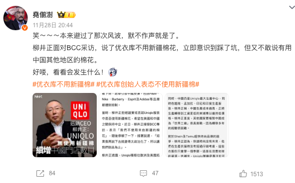 若事前不能避免,优衣库这个创始人在回复时,用的词确实很谨慎,他只讲了事实(没有),但如果能补一句,比如“如果不受到政治因素,我们是非常乐意用来自全球的优质棉花的,包括不限于新疆棉。”