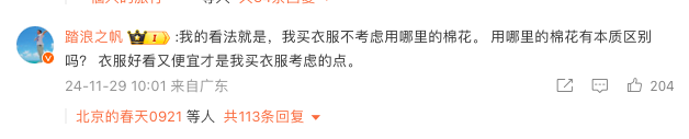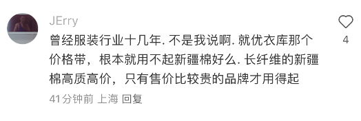 网友13:曾经服装行业十几年,不是我说啊.就优衣库那个价格带,根本就用不起新疆棉好么,长纤维的新疆棉高质高价,只有售价比较贵的品牌才用得起
