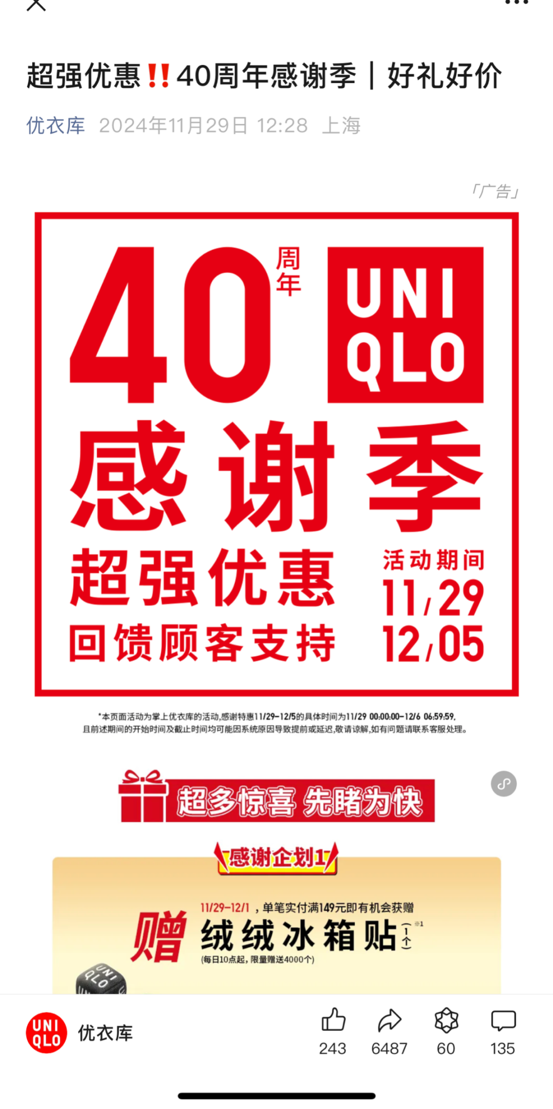 今天(29日)中午12点28分,优衣库 官方微信推送了一条推文,题目是《超强优惠!40周年感谢季》。