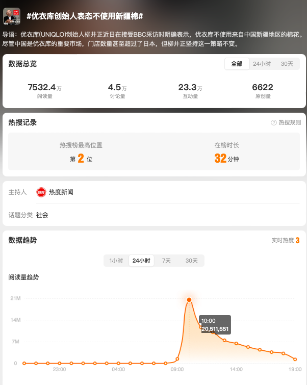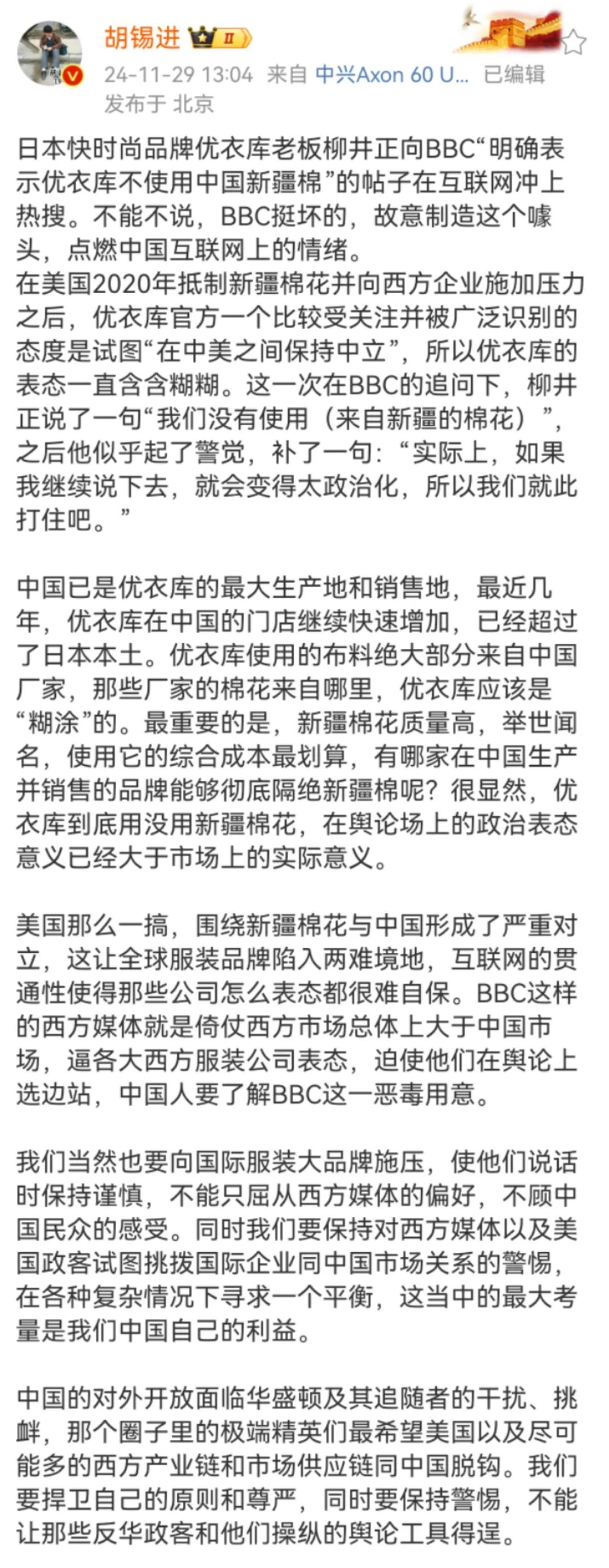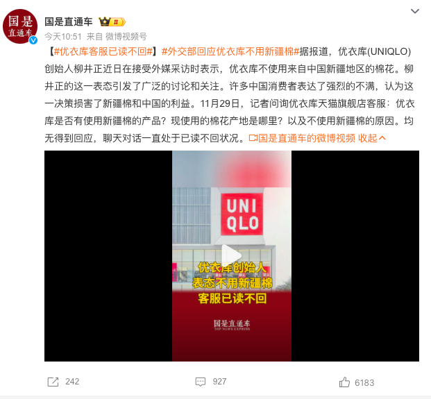 1、昨天(11月28日)之前(具体时间不详),BBC采访了优衣库创始人柳井正,后者说出了那句“没有使用新疆棉”。(也就是说,优衣库的pr应该在采访后就知道了此事)
