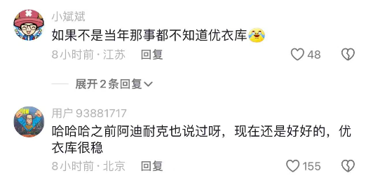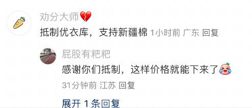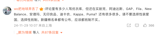 网友2:评论里有多少人骂优衣库,但还在买耐克、阿迪达斯、GAP、Fila、NewBalance、安德玛、无印良品、迪卡农、Kappa、Puma?还有很多很多。请不要选择性装爱国,选择性抵制。新疆棉名单都有公布,应该都抵制不买。