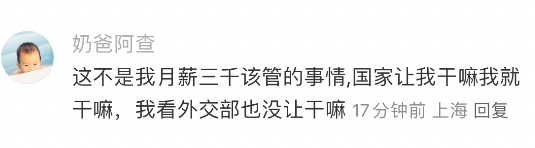 网友10:这不是我月薪三千该管的事情,国家让我干嘛我就干嘛,我看外交部也没让干嘛