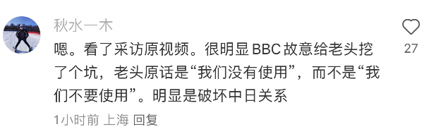 网友6:嗯。看了采访原视频。很明显BBC故意给老头挖了个坑,老头原话是“我们没有使用”,而不是“我们不要使用”。明显是破坏中日关系