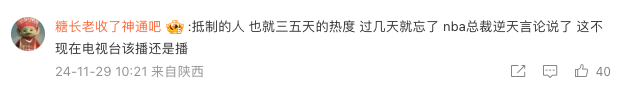 网友3:抵制的人也就三五天的热度 过几天就忘了 nba总裁逆天言论说了 这不现在电视台该播还是播。