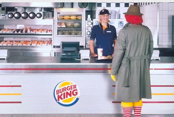 而麦当劳则是在一条视频广告中先展现出小男孩手里拿的麦当劳薯条被其他人抢劫一空,后来男孩用汉堡王的袋子给麦当劳薯条打掩护就没有被抢走的情节。