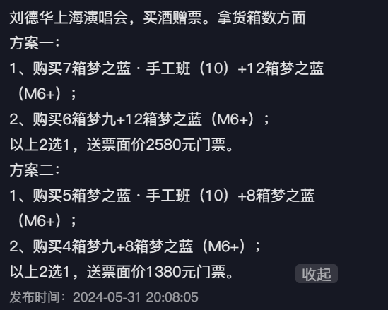 就拿酒业来说,白酒玩家“买酒赠票”的促销手段,在粉丝这里就变成了“买票赠酒”,梦之蓝赞助的刘德华上海演唱会一票难求,有网友就晒出攻略,另辟蹊径: