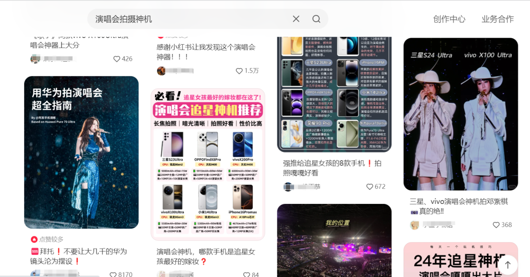 比如最典型的3C行业,“演唱会拍摄神机”俨然已经变成各大手机品牌争抢的名号,三星、OPPO、vivo、华为……几乎都有一款被称之为演唱会神器的长焦旗舰机,在小红书上搜索“演唱会拍摄神器推荐”,笔记篇数也高达27万+。更衍生出了手机租赁的市场,有网友称赶了十场演唱会,凭租手机挣了五万。