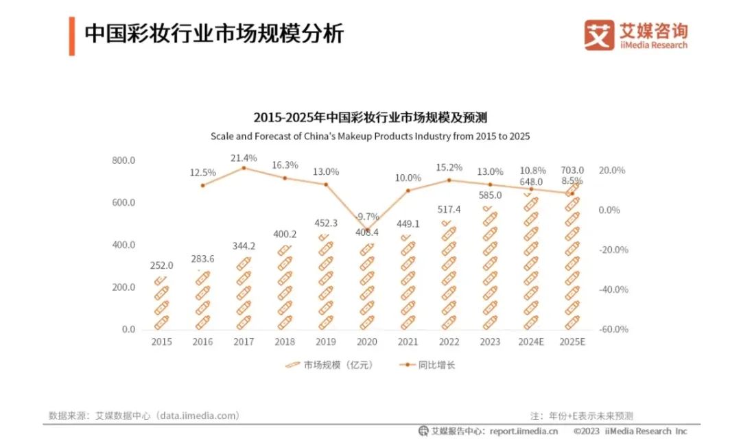根据数据显示,中国彩妆行业在疫情后的复苏以及未来增长趋势,体现了消费者对美妆产品需求的强劲。特别是2021年市场的回升以及2023年13%的增长,说明了尽管疫情带来了短期的冲击,但随着国内消费者需求的恢复,彩妆市场重新焕发活力。在未来,2025年中国彩妆行业市场规模预测703亿元,未来前景可观。