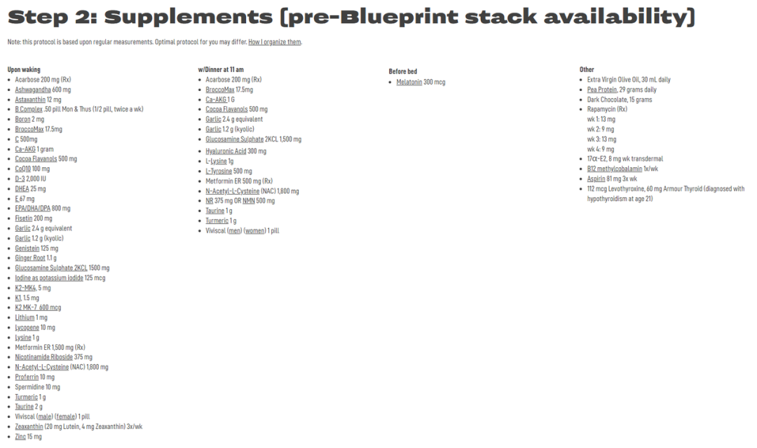 然后是良好的饮食习惯,每个人每天都要是三顿饭,这就是最好的药物。我每天吃大量的蔬菜、坚果、豆类、橄榄油等等,并且从来不吃糖油垃圾食品。在 Blueprint 的网站上我详细公布了我的食谱,包括吃什么、吃多少。