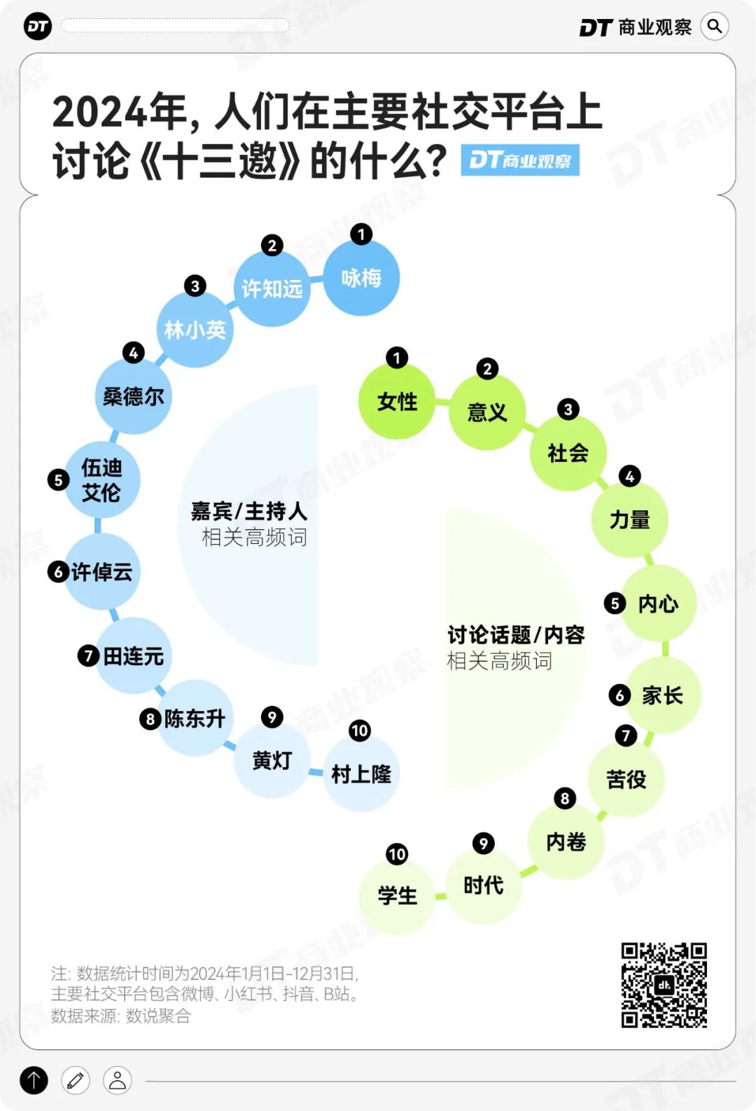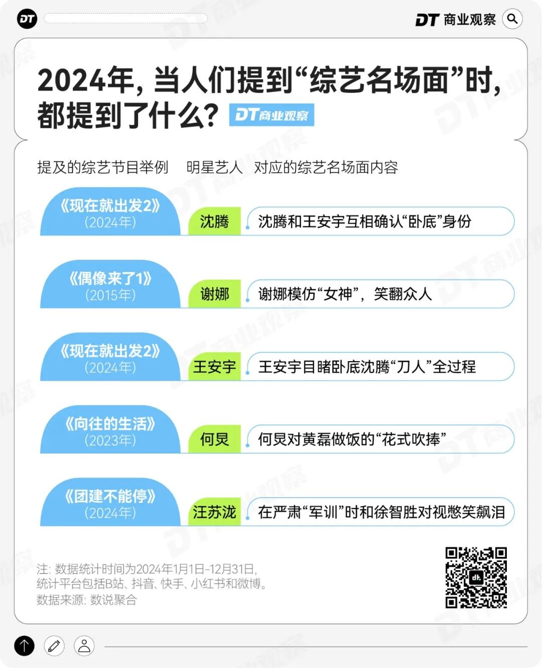 2024年,上述五个平台里和“综艺名场面”相关的高频词中,明星艺人的排名往往会更高,然后连带着相关的综艺一同破圈。
