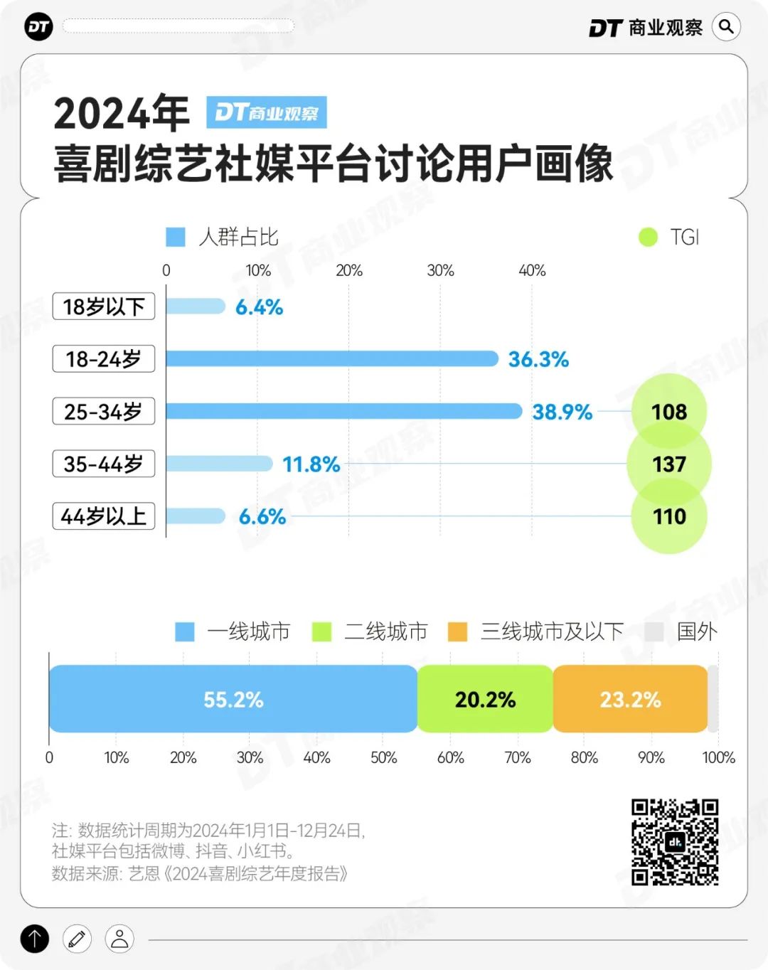 结合偏好喜剧综艺的人群画像来看,75.2%的观众集中在18-34岁,但35-44岁、和44岁以上的年龄段人群TGI也高于100,这意味着他们对喜剧类综艺的偏好性也比较高。