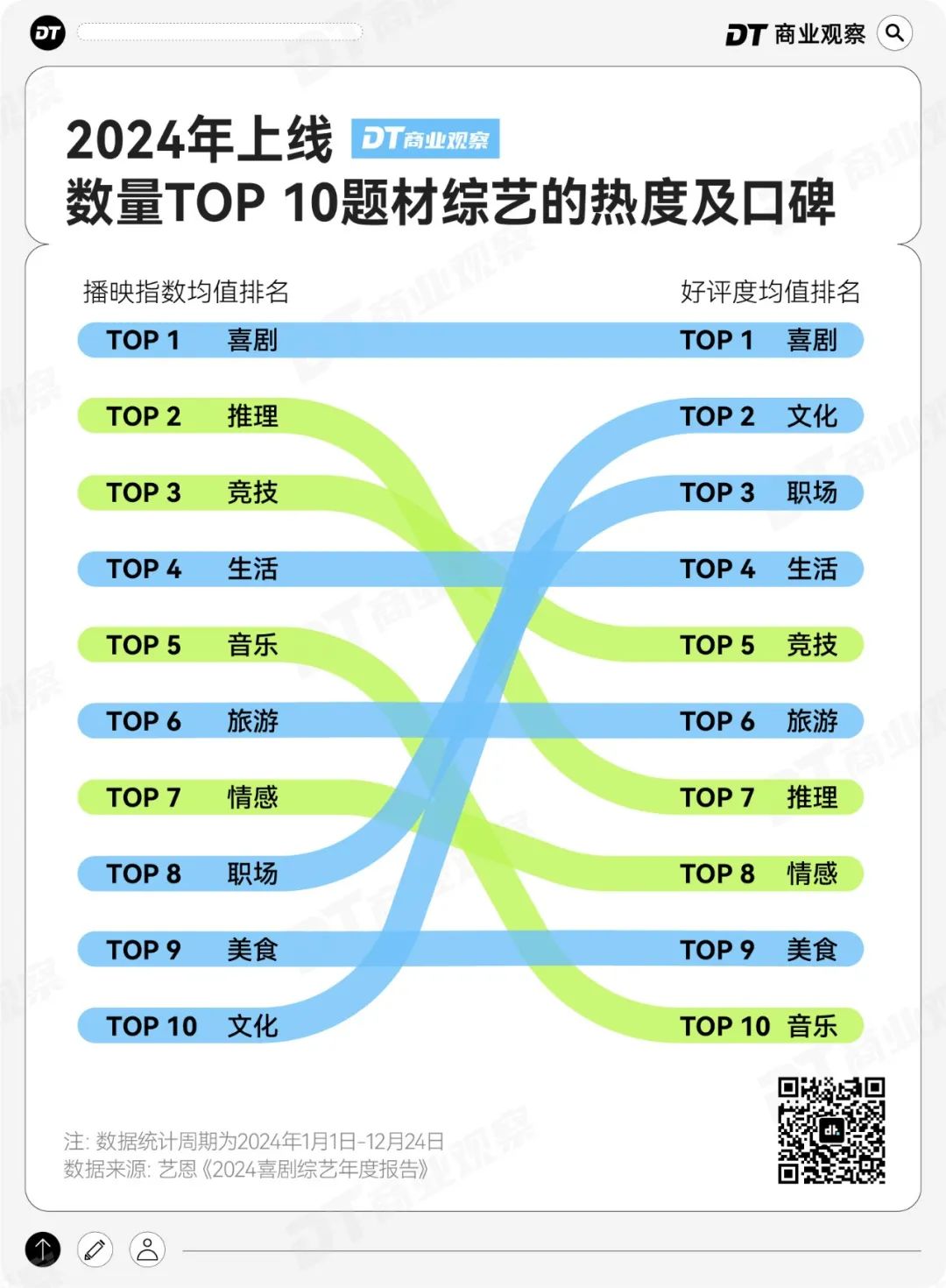 生活、旅游、美食、竞技类综艺,播放热度和口碑排名一致或接近,“德很配位”;