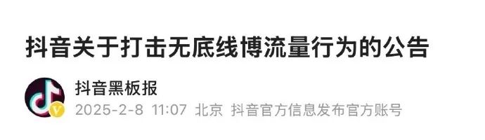 大家有没有注意,抖音发公告的时候,标题用了“无底线博流量行为”。