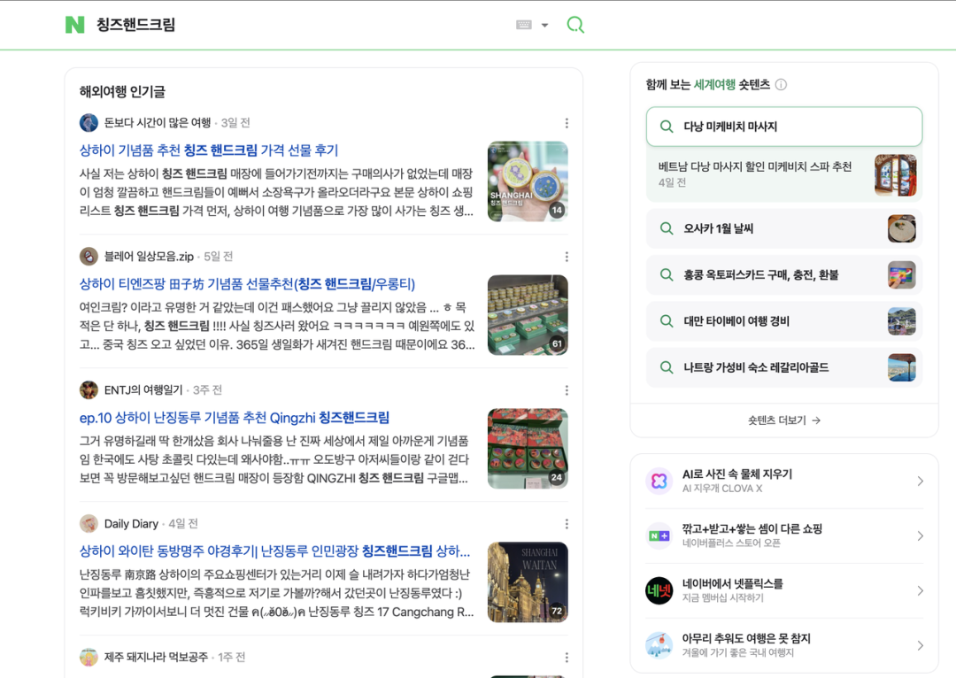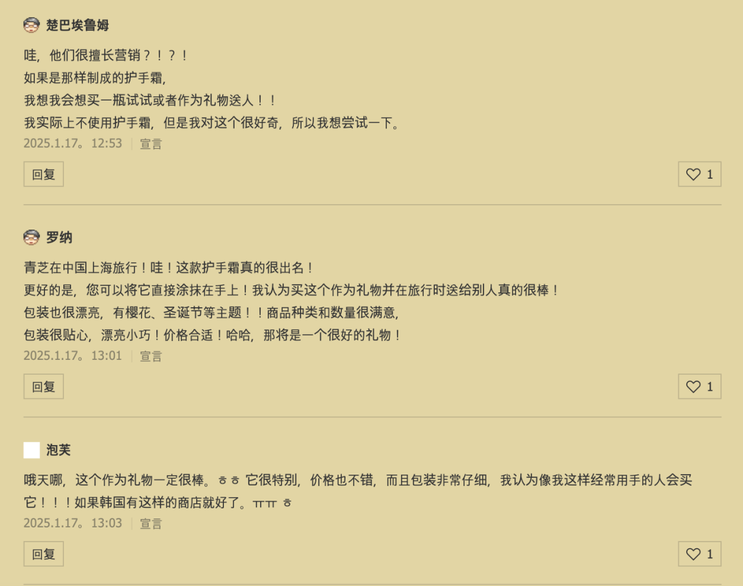 在韩国的超级 App Naver 上搜索 칭즈핸드크림(青稚护手霜),能搜到不少关于青稚的攻略。韩国博主 먹보공주 在博客里事无巨细地分享了推荐购买的理由,包括门店随处可见、有 365 天生日花可以对应选购、附有丝带蝴蝶结的包装漂亮而且免费、门店干净、可以在洗手后体验产品(洗手液是 Aesop)、有很多具有上海特色的设计……作为送给朋友的伴手礼是完美的存在。不少读者表示种草,希望韩国也有这样的商店。