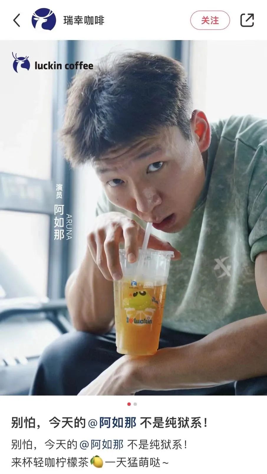 不久之后,瑞幸又找到在 电视剧《狂飙》 中饰演莽村村长混混儿子的 演员“阿如那” 代言。