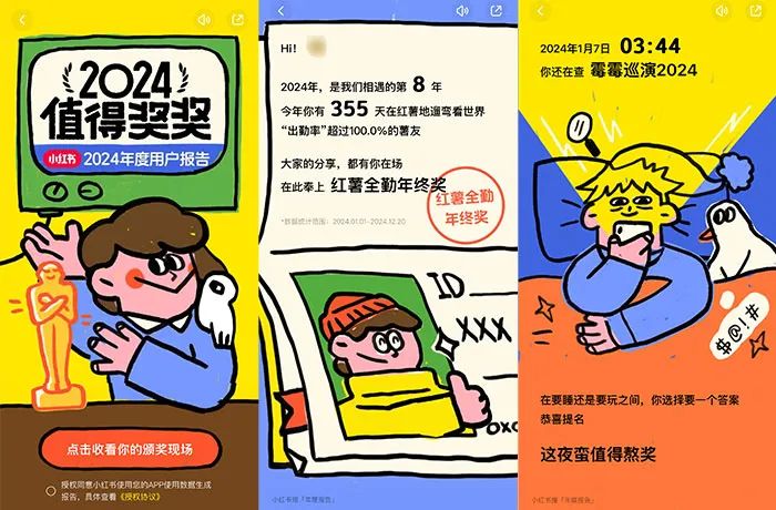 2024年的年度报告俨然成为平台与用户情感沟通的重要媒介,各大平台在内容设计上亮点频出,形式也愈发多样化。美团创新性地将年度报告与热门短剧结合,用户不仅可以体验“霸总”“仙尊”等角色,还能看到消费数据在虚拟剧情中的生动展现。小红书则以“颁奖典礼”为主题,用趣味奖项表彰用户一年的搜索、互动和分享行为,让每个用户都感受到成就感与仪式感。