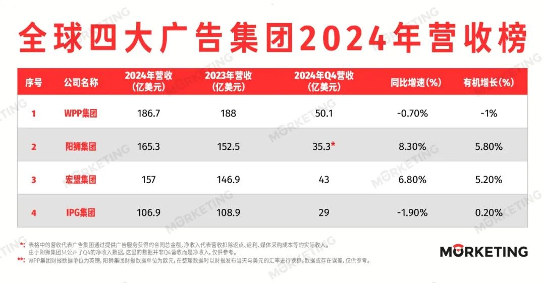 四大广告集团2024年营收榜:阳狮自称登顶净收入第一;中国市场成WPP最大短板