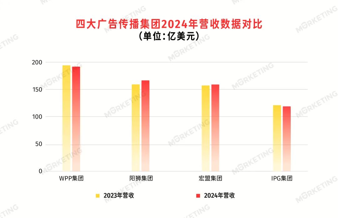 且不说处于行业第二的阳狮集团在去年第五次大幅超越行业水平,以8.3%的营收增速飞快向WPP的榜首地位逼近;营收规模稍弱一些的宏盟集团和IPG集团更是立下了要在2025年内完成合并的军令状,一旦合并成功,全球四大广告集团格局将彻底改写,榜首的宝座也自然易主。
