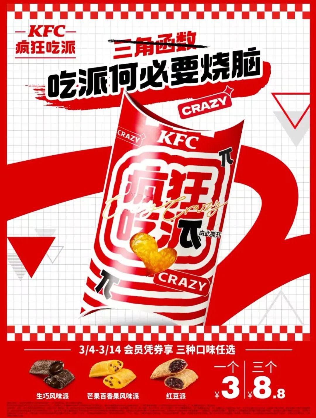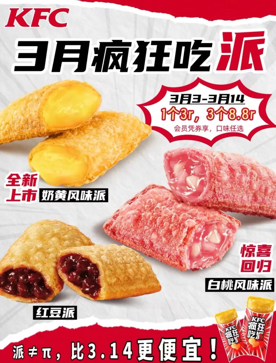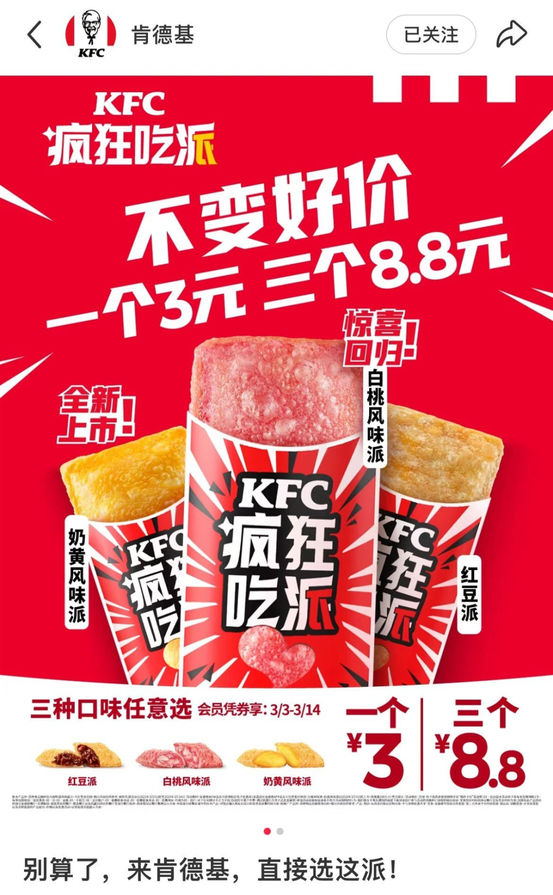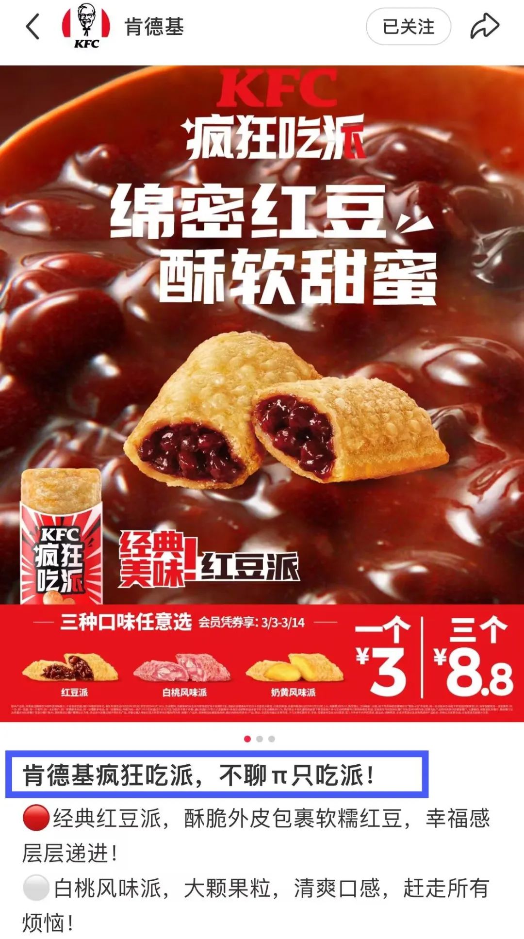 此时, 今年3月3日肯德基 在社媒平台上发布的图文标题“不聊Π只吃派”就显得很有针对性了。
