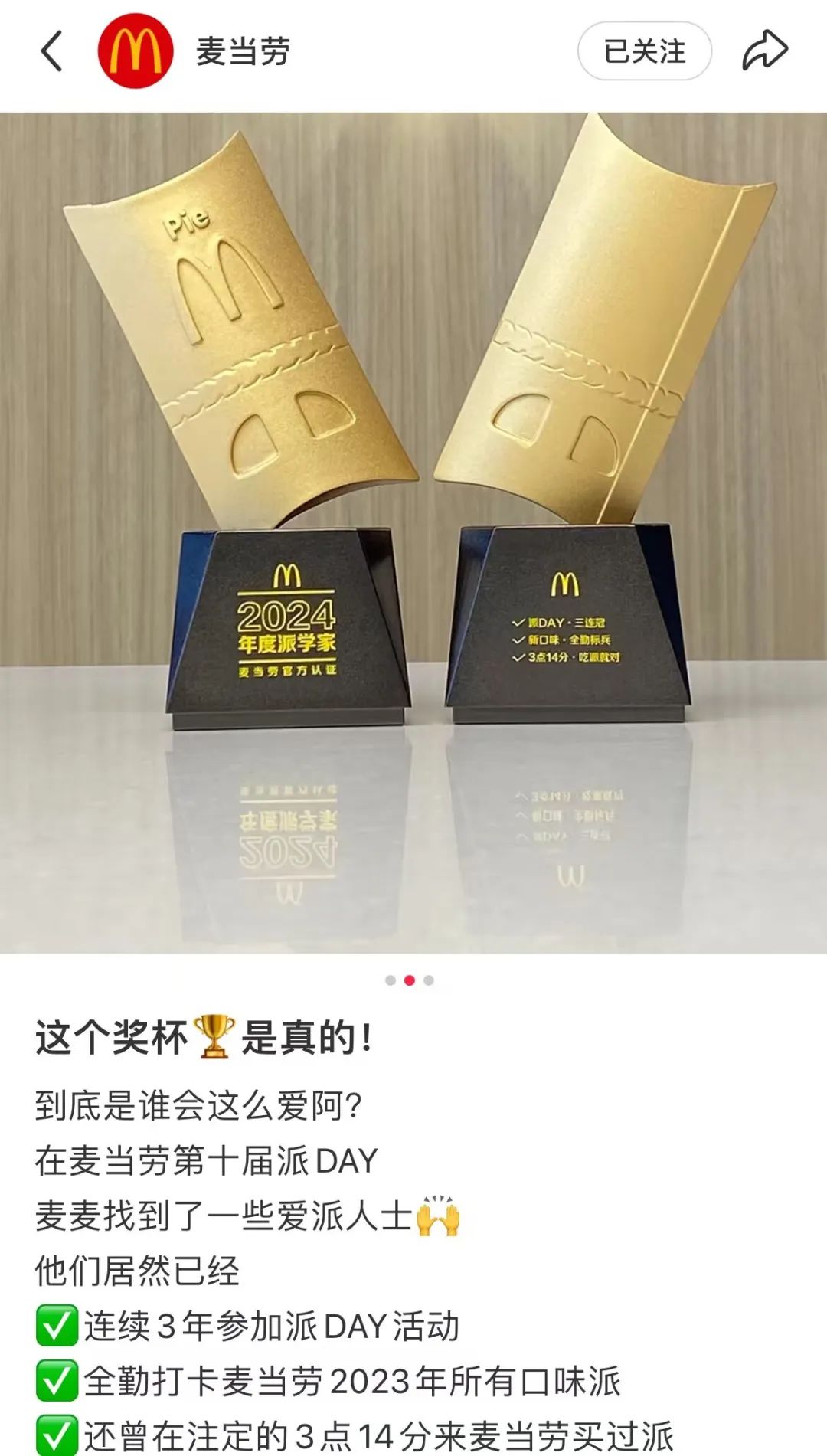 此外,麦当劳还为 满足三条爱派条件的“年度派学家” 颁发了 以品牌产品为原型的实体奖杯 。
