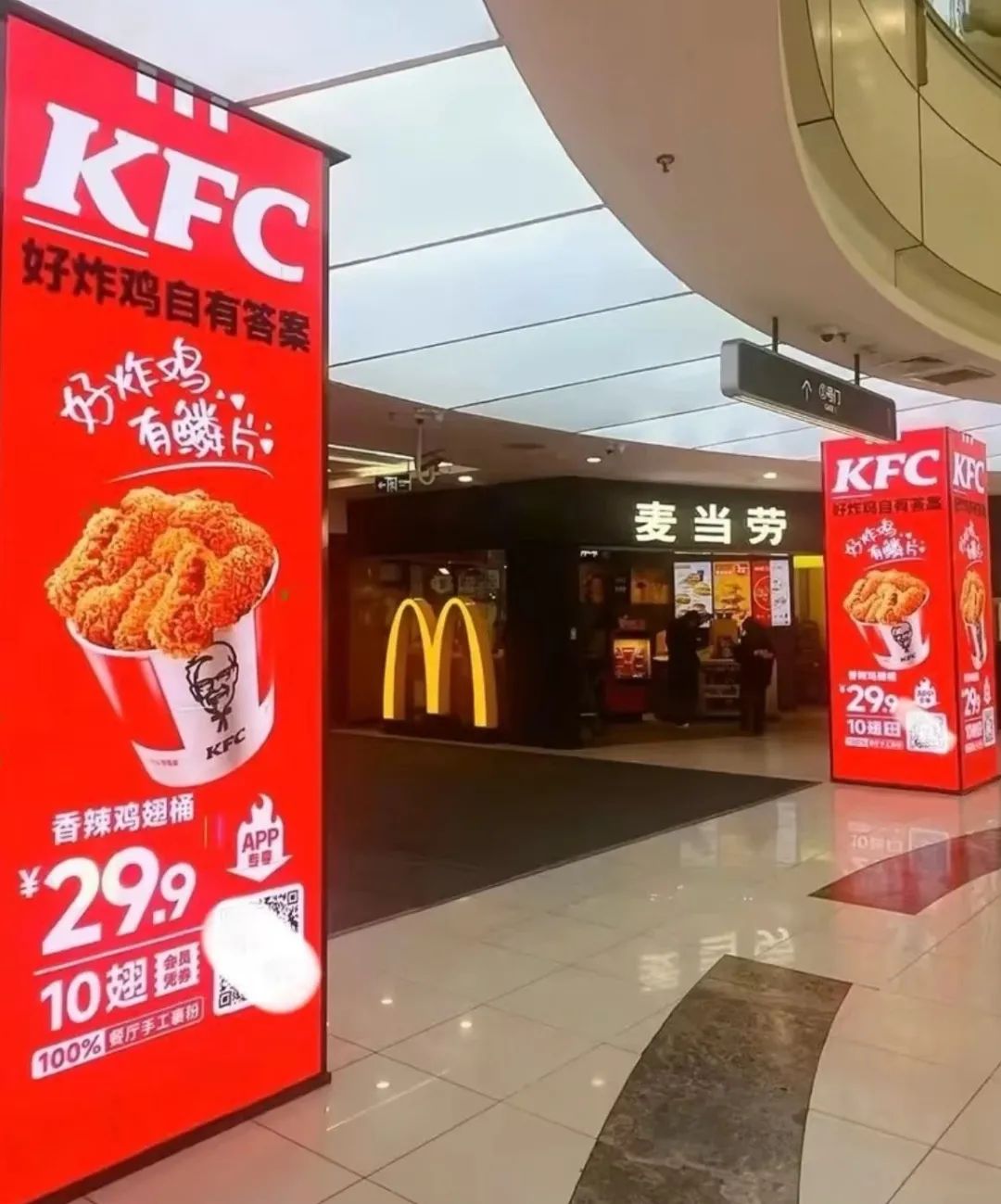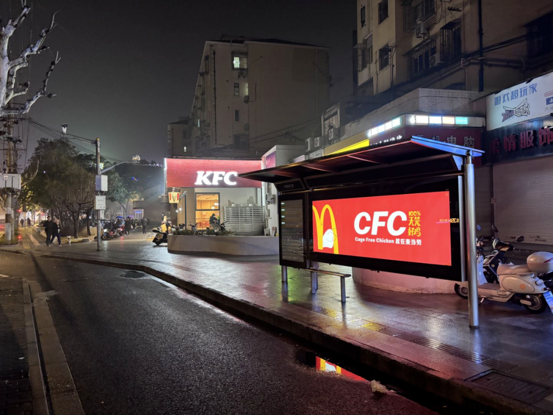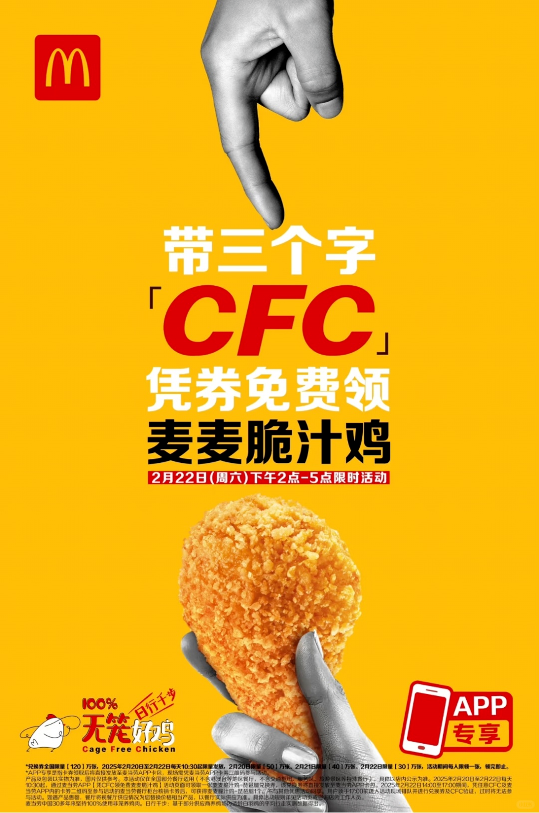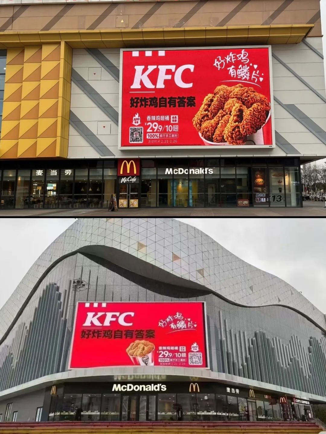 先是 麦当劳 用一招 “CFC”无笼好鸡 的海报在KFC门店前贴脸开大。