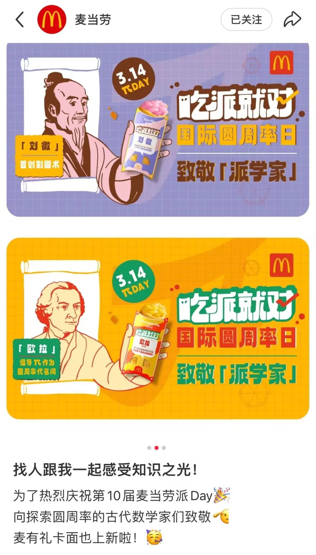 去年 ,麦当劳就推出了一场 以“吃派就对”为主题的营销活动 ,邀请用户一起致敬历史上的“派学家”