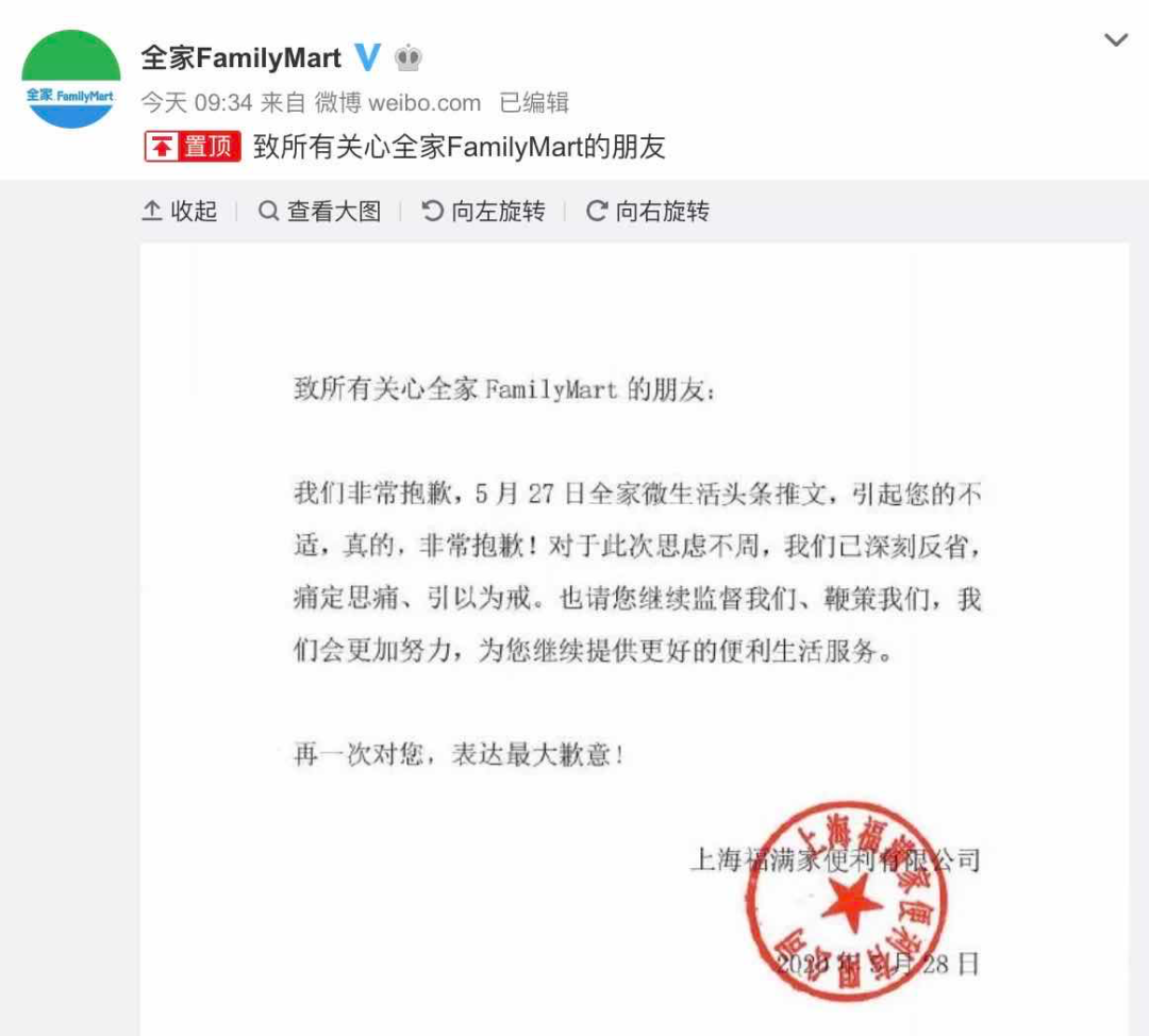 回顾:5月27日,全家在公众号上发布推送虽然内容是冰激凌,但是封面标题非要搞点低俗内容打擦边球来吸引眼球,28日全家在官方微博上声明道歉。