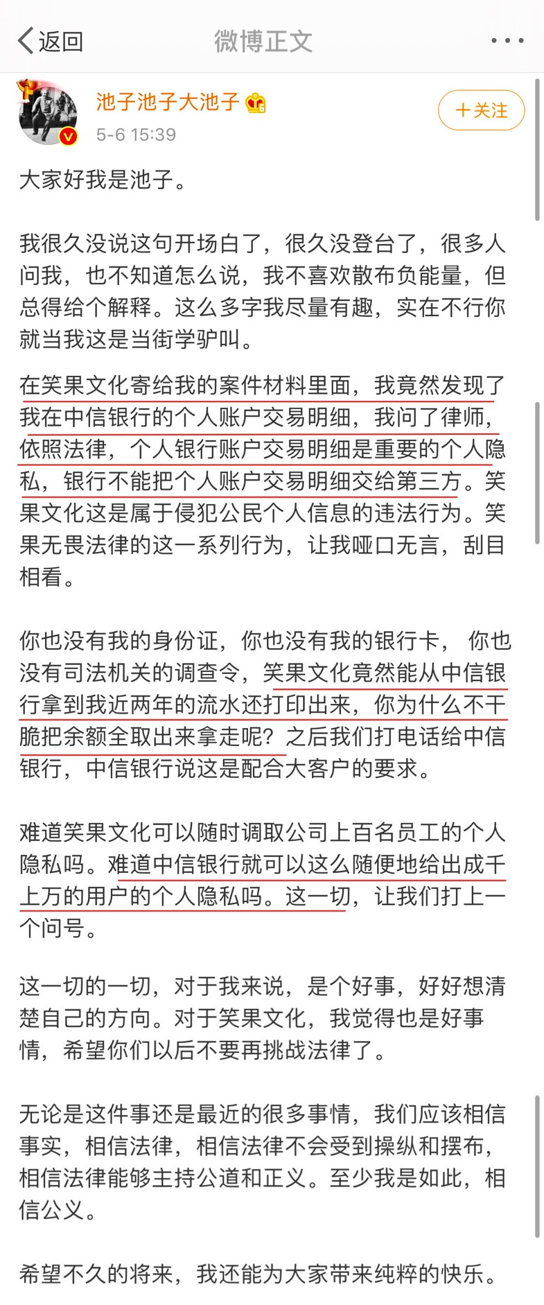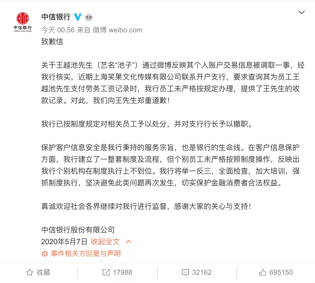 回顾: 池子和笑果文化因为劳动合同微博对峙,池子的声明里还牵扯到第三方中信银行「泄漏用户个人隐私」的失信问题,池子在微博中@中信银行,中信银行被迫深夜发文回应。