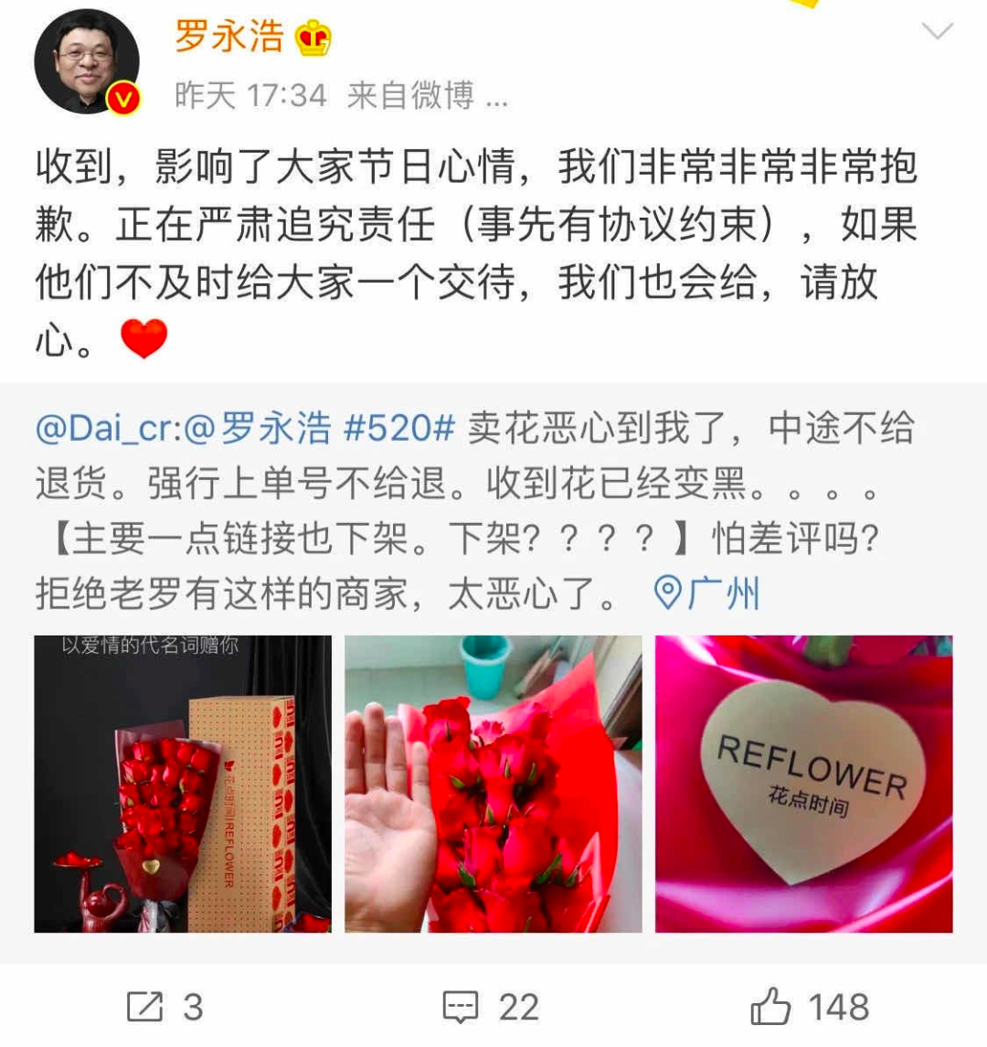 回顾: 罗永浩直播带货花点时间鲜花,520当天出现问题,罗永浩连发29条微博给消费者道歉,并发表道歉声明。