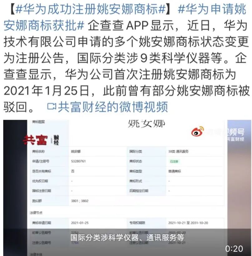 最早在2021年的时候,华为公司注册姚安娜商标的企业行为还登上过微博热搜。